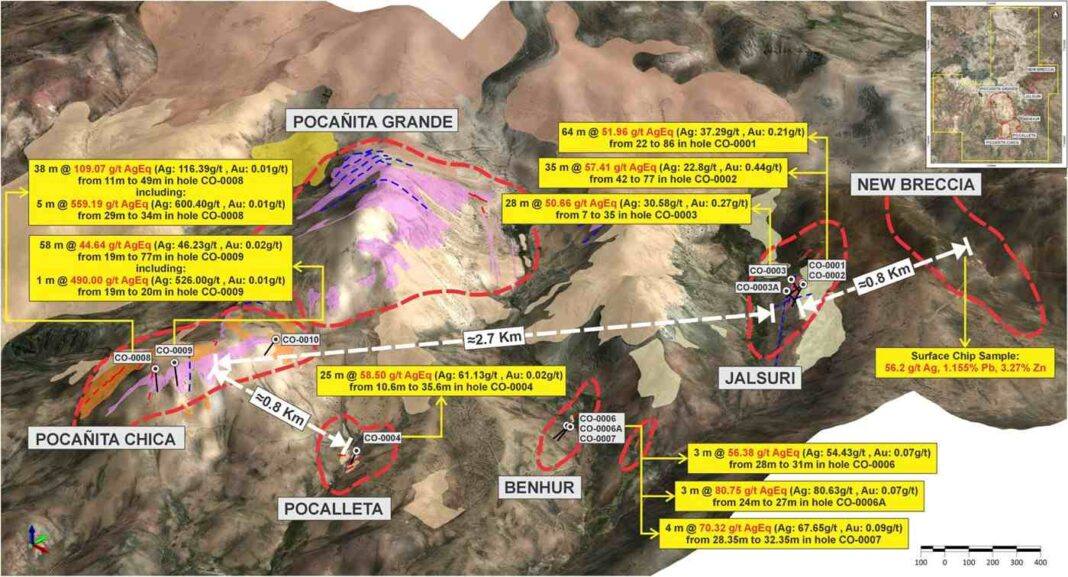 钻探计划测试了沿NE-SO方向约2.7公里走廊上的四个目标,均发现了银矿化,包括Pocañita Chica、Pocalleta、Jalsuri和Benhur。这证实了一个稳健的银和多金属系统的存在,该系统在走向和深度上仍具有扩展的开放性。化验结果表明,地表识别的银和金矿化在岩帽层内继续向深部延伸,这在玻利维亚的类似系统中较为罕见,表明科苏尼奥在深部和覆盖区具有新发现的潜力。
