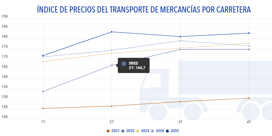 2025年第四季度,公路货运服务价格延续了上涨势头。根据交通、出行和城市议程部发布的最新数据,与2024年第四季度相比,费率上升了3.57%,相比上一财年第三季度增长0.94%,指数达到182.8点。
