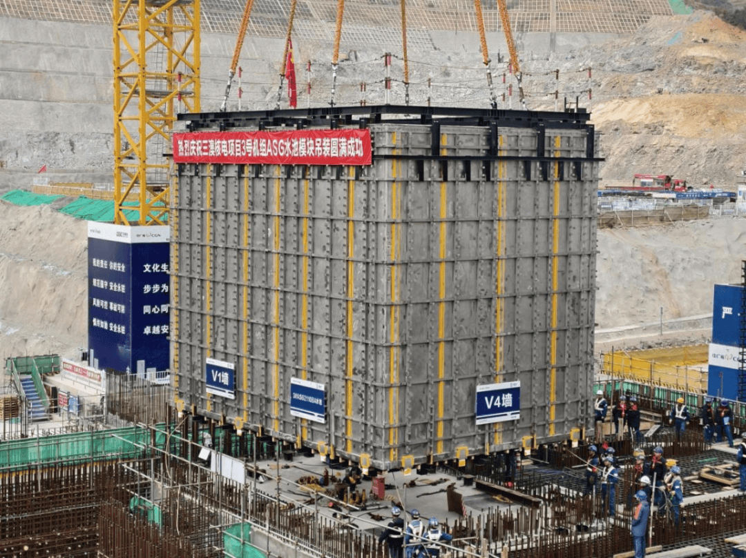 2月4日,三澳核电项目3号机组安全厂房应急给水系统不锈钢水池池壁模块顺利吊装就位。