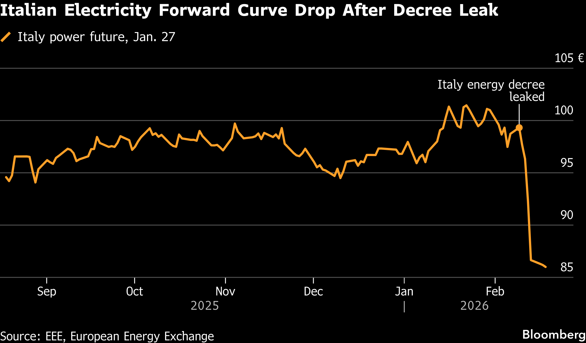 意大利的电力价格在欧洲处于较高水平,针对企业排名第二,针对家庭排名第四。通过阻止发电商将排放费用转嫁给终端用户,政府计划为消费者和能源密集型行业提供数十亿欧元的纾困。随着交易商为改革布局,意大利年度远期电力价格连续下跌,本月跌幅接近15%。尽管有望降低电费,但可能压缩公用事业和可再生能源发电商的利润率,包括意大利国家电力公司、爱迪生公司和ERG公司。