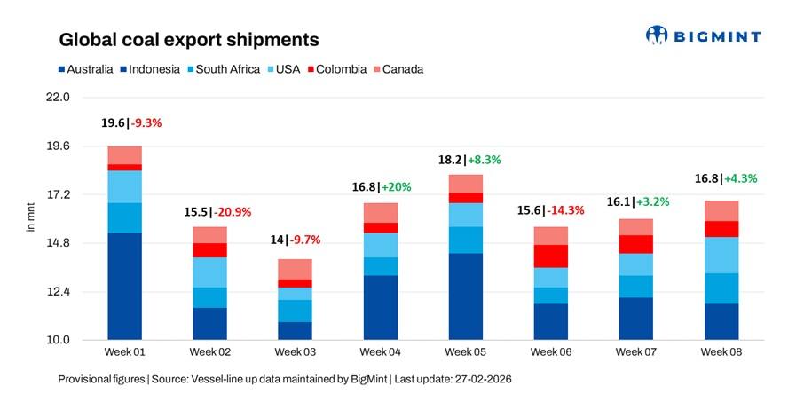 在第08周(2026年2月14日至2月20日),全球煤炭出口量环比增长4.3%,达到1680万吨,创下两周来的最高点。这一增长主要得益于大西洋地区装载量的显著回升,而太平洋地区的出口则保持相对平稳。