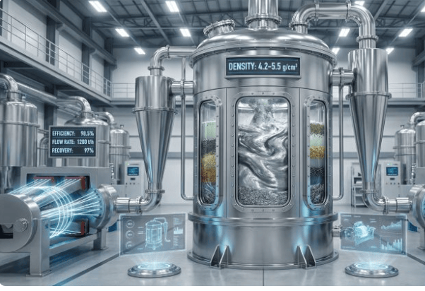 该超高密度介质分离技术基于重力分离原理,利用重液体或悬浮液建立比重阈值,从废石中回收有价值的矿物。传统系统通常采用硅铁或磁铁矿悬浮液,可处理1-150毫米粒度范围的物料,介质回收率超过95%。