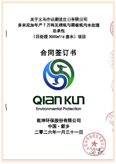 近日,乾坤环保股份有限公司与多米尼加某造纸厂正式签约,承接年产7万吨瓦楞纸与箱板纸污水处理总承包项目。此次签约标志着乾坤环保在美洲环保市场取得新进展,该总承包项目将针对造纸过程中产生的高浓度有机废水提供定制化治理方案。