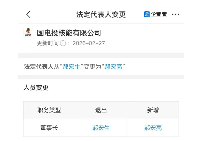 2月27日,中国国电投核能有限公司(下称“电投核能”)法定代表人从郝宏生变更为郝宏亮。