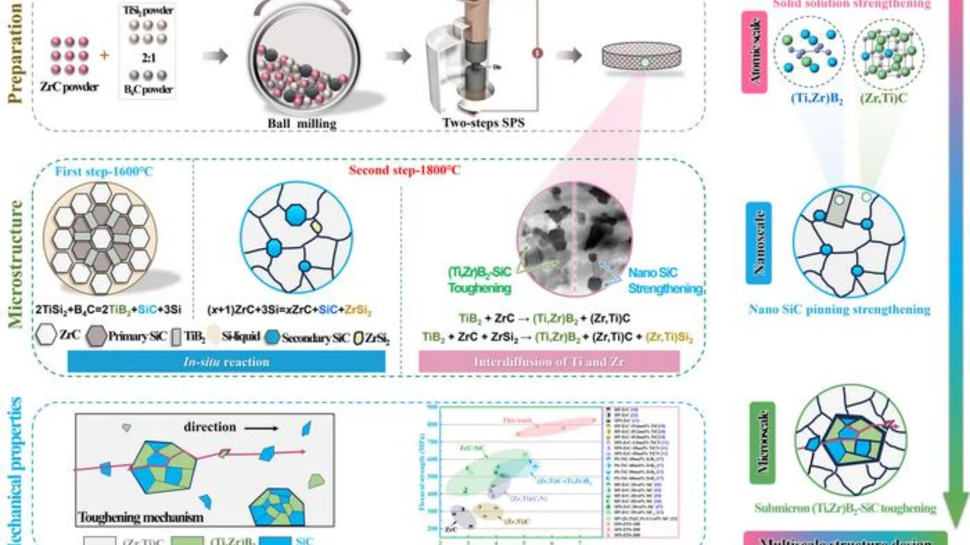 工艺的第一步在1600摄氏度下进行,TiSi2与B4C反应生成TiB2和SiC,保持三分钟后温度升至1800摄氏度,以分离反应和扩散过程。释放的硅原子与ZrC基体反应形成ZrSi2和二次SiC,最终产生(Zr,Ti)C和(Ti,Zr)B2固溶体。