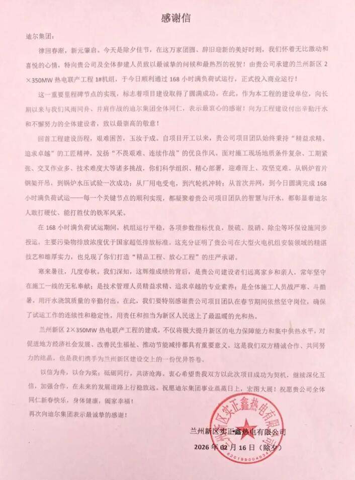 2026年2月16日,在农历丙午年除夕当天,中国迪尔集团第三公司承建的兰州新区2×350MW热电联产工程1号机组顺利通过168小时满负荷试运行,正式移交生产。机组试运期间运行稳定,建设团队在严寒中坚守岗位,为项目投产提供了保障。