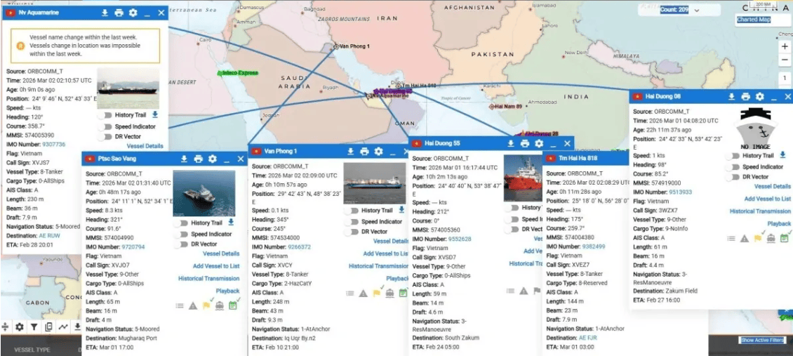 截至3月3日,越南海事与水道管理局确认,八艘搭载越南船员的船只在中东地区运营,位置靠近阿联酋加沙岛、沙特达曼港、伊拉克乌姆盖斯尔和阿联酋哈姆里耶港等关键海上地点。这些船只由越南石油技术服务公司和越南石油油轮公司等多家企业管理。