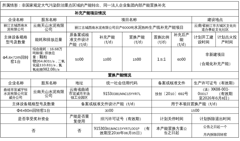 该产能补充项目位于云南省丽江市古城区文化街道办事处文化社区,属于非国家规定大气污染防治重点区域的产能转出,并在同一法人企业集团内部进行置换补充。项目涉及主体设备为一台Ф8×72回转窑,预计补充后产能达到6000吨/日。能耗方面,综合能耗为16.68万吨标煤,排放总量包括颗粒物264.801吨/年、二氧化硫110.81吨/年,氮氧化物数据待定。原设计产能为5000吨/日,补充产能1000吨/日,置换产能1500吨/日,置换比例未明确,补充后总产能为6000吨/日。项目为非新建项目,归类为合规化补充产能,计划开工建设时间和点火投产时间均未指定。