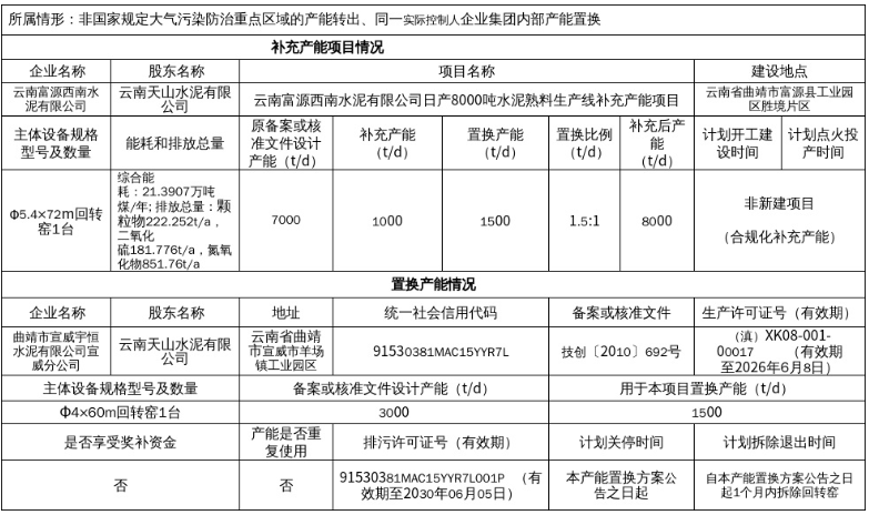 该项目位于云南省曲靖市富源县工业园区胜境片区,属于非国家规定大气污染防治重点区域的产能转出和同一实际控制人企业集团内部产能置换。项目主体设备为一台Ф5.4×72回转窑,原设计产能为每日7000吨,通过补充产能10吨和置换产能15吨,置换比例为0.5,补充后总产能达到每日80吨。能耗和排放数据为:综合能耗21.3907万吨煤/年,颗粒物222.252吨/年,二氧化硫181.776吨/年,氮氧化物851.76吨/年。
