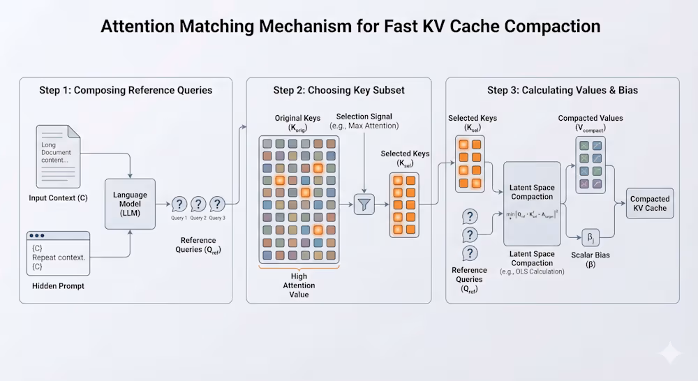 大型语言模型在处理长上下文时,KV缓存会随对话长度扩展,消耗大量硬件资源,成为内存瓶颈。注意力匹配技术通过保留“注意力输出”和“注意力质量”两个数学属性,使用参考查询和代数方法进行快速压缩,避免了基于梯度的优化,实现了高压缩比和高质量。