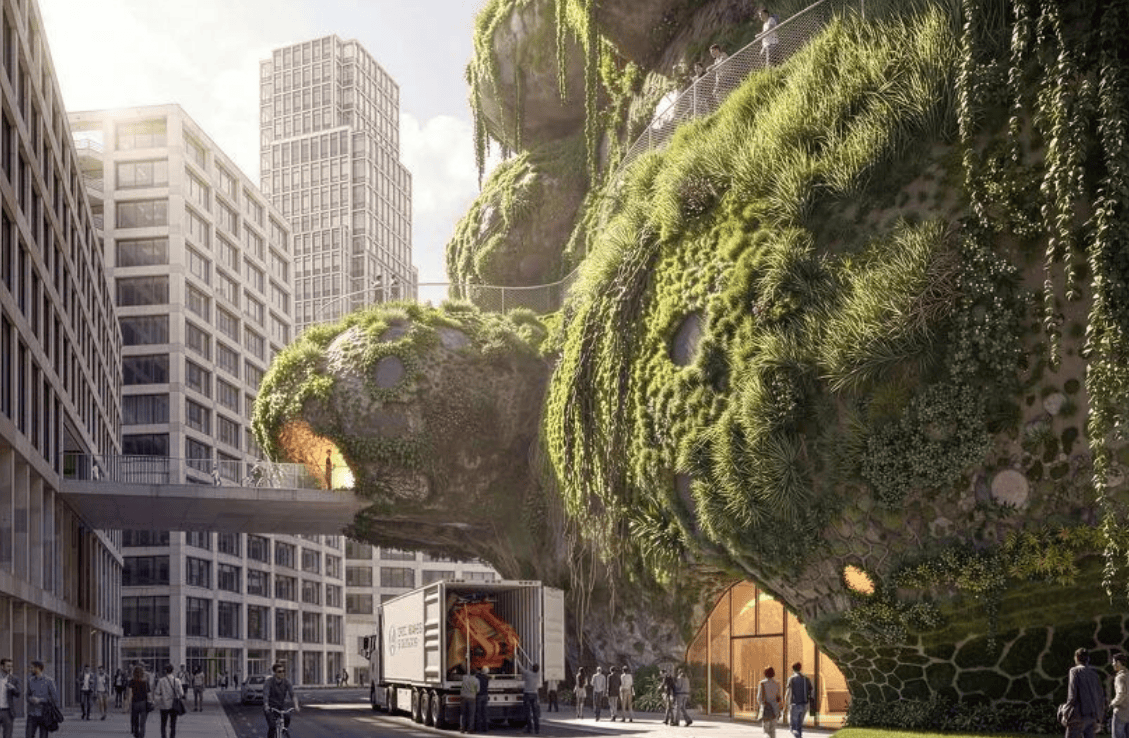 最受关注的建筑设计来自鹿特丹本土的MVRDV事务所,他们携手设计师Joris Laarman共同提出了名为“鹿特丹岩石”(Rotterdam Rocks)的概念。效果图显示,该建筑设计如同被植被覆盖的巨型岩石群落,入口形似巨龟张开的嘴。MVRDV表示:“鹿特丹岩石是一座由活体岩石堆叠而成的景观,将建筑转化为可再生的城市生态系统。它延续了鹿特丹的实验精神,展示了未来的建筑可以如何融合自然与公共生活。”这一建筑设计将自然意象与公共功能深度融合,成为竞赛中的亮点方案。