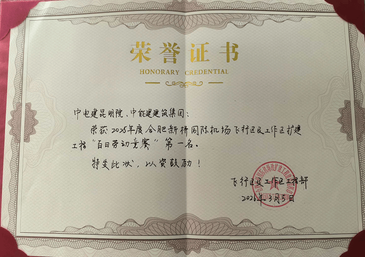 中能建建筑集团合肥新桥国际机场改扩建工程飞行区及工作区工程部组织的“百日劳动竞赛”活动圆满落下帷幕,经过激烈角逐与严格考评,新桥机场110千伏输变电外线项目在众多参赛单位中脱颖而出,成功斩获竞赛第一名的殊荣,用实干与担当书写了项目建设的奋进篇章。