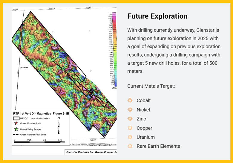Glenstar Minerals在美国内华达州拉斯维加斯西南约40英里处推进其旗舰资产Green Monster项目,该项目是一个钴-镍-铜-铀多金属矿化资产。