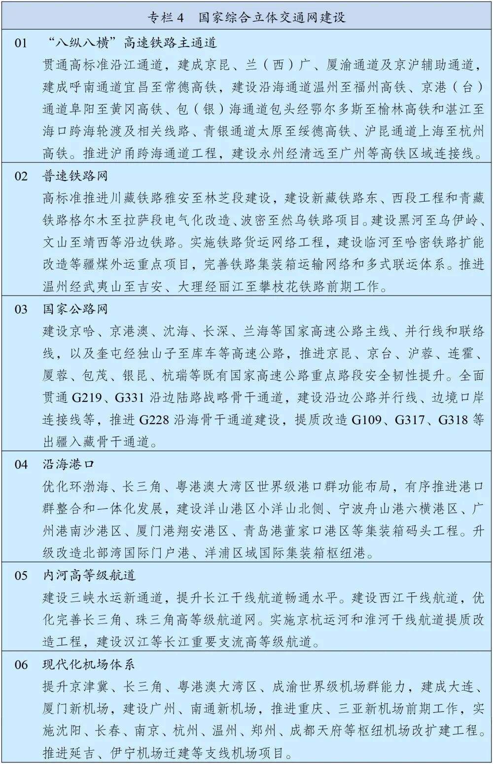 完善国家综合立体交通网主骨架,高质量建设沿海沿边沿江、出疆入藏、西部陆海新通道等战略骨干通道,基本建成“八纵八横”高速铁路主通道和国家高速公路网,推进内河高等级航道提质升级,基本建成世界级港口群和机场群。