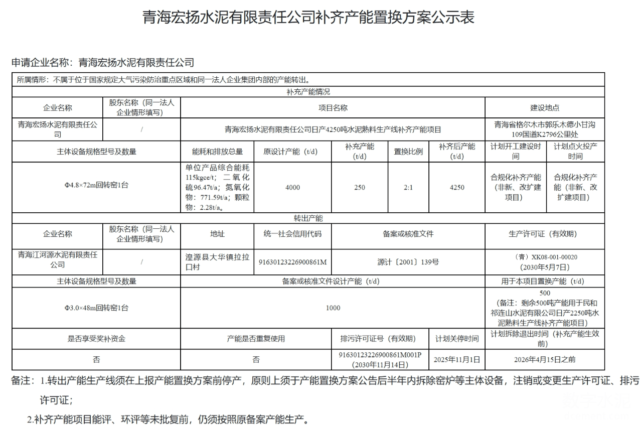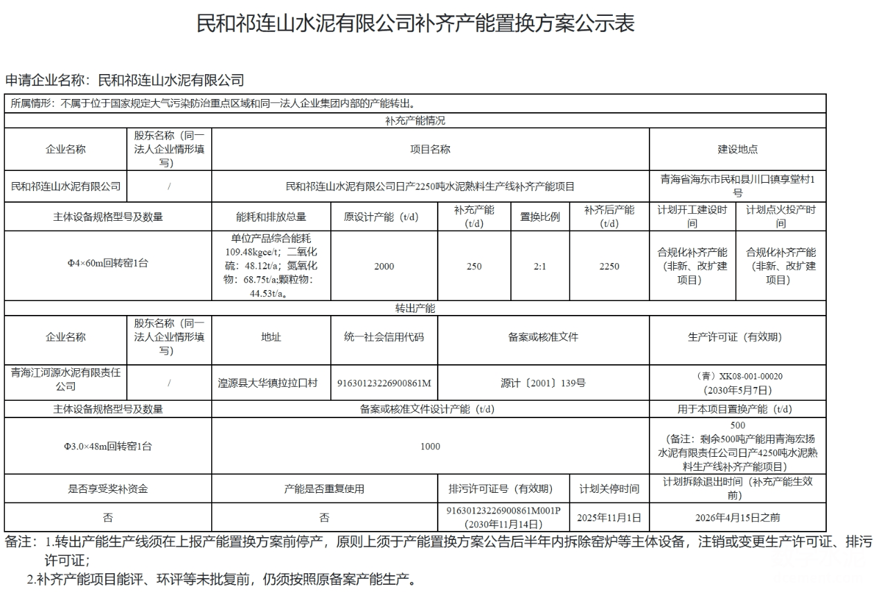 根据公示内容,青海江河源水泥有限责任公司一条1000吨/日的水泥熟料生产线将用于产能置换。该生产线计划在2026年4月15日前拆除退出,其产能分别补充给民和祁连山水泥有限公司和青海宏扬水泥有限责任公司,置换比例为2:1,体现了产能置换的严格规范。