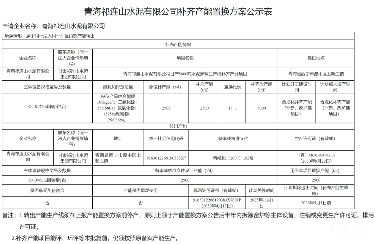 青海祁连山水泥有限公司的5000吨/日生产线原设计产能为2500吨/日,补充2500吨/日产能,置换比例为1:1。该公司一条2500吨/日的生产线将用于本项目置换,计划在2026年5月1日前拆除退出,确保产能置换过程有序进行。