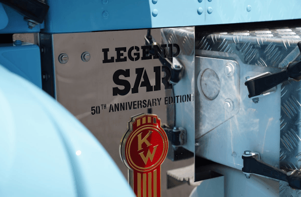 Kenworth在2021年推出这款Legend SAR时,整个生产批次在一天内售罄,显示其高需求。车辆细节包括圆形油箱、蜘蛛轮和标志性的DWT淡蓝色涂装。