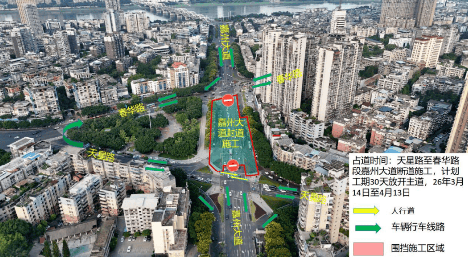 为提升城市排水防涝能力,乐山市市中区嘉州大道排水防涝改造工程正有序推进。因后续施工需要,嘉州大道天星路口至春华路口路段将于3月14日起实施为期一个月的断道施工,持续至4月13日。断道期间,机动车、非机动车及行人需根据现场交通导行指示绕行。