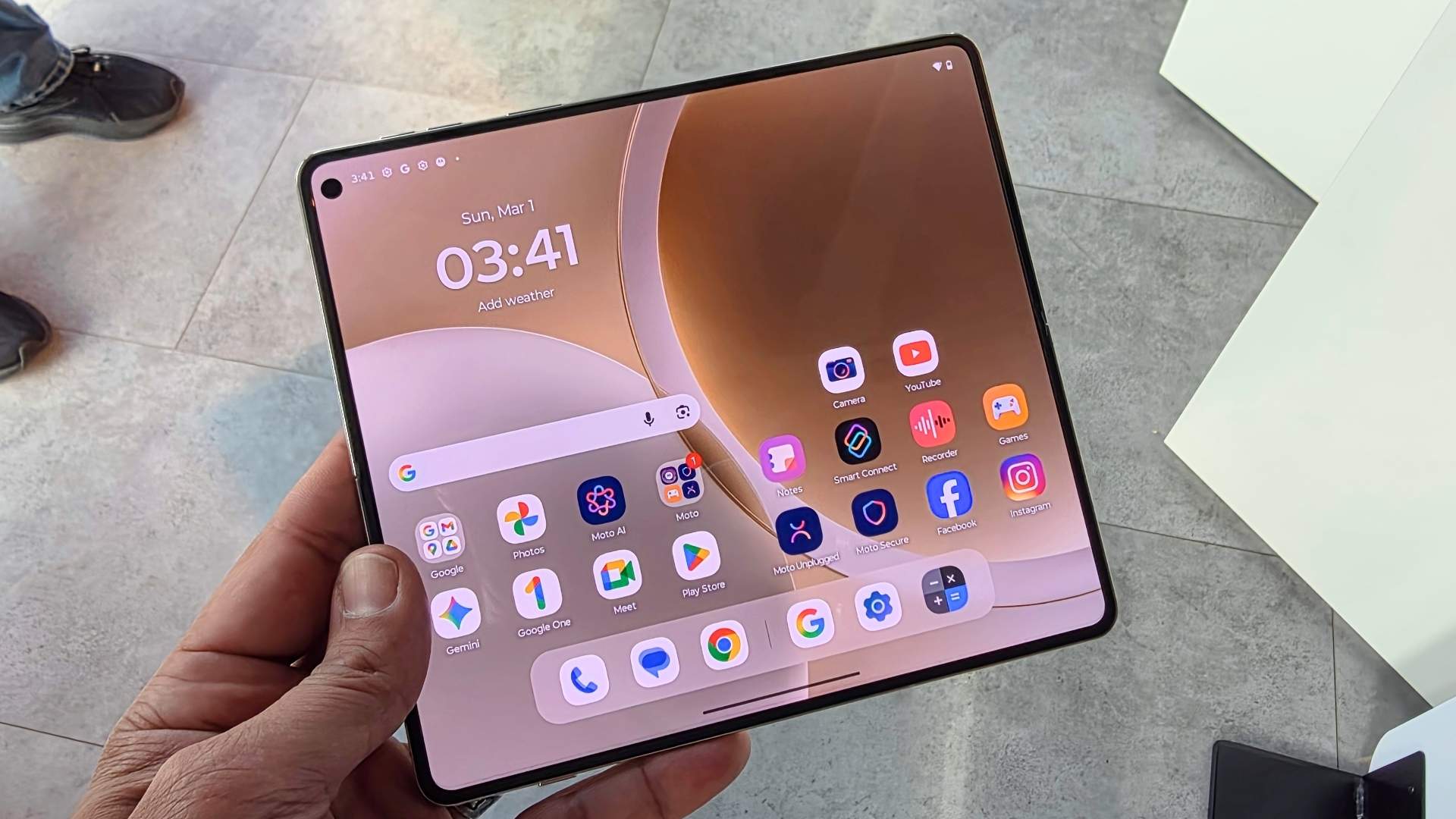 在西班牙巴塞罗那举行的世界移动通信大会上,摩托罗拉展示了其新款Moto Razr Fold折叠屏手机。该设备此前于今年1月的CES展会上首次亮相,目前发布日期和售价尚未公布。从现场体验来看,Razr Fold在多个方面与三星Galaxy Z Fold 7形成竞争关系。