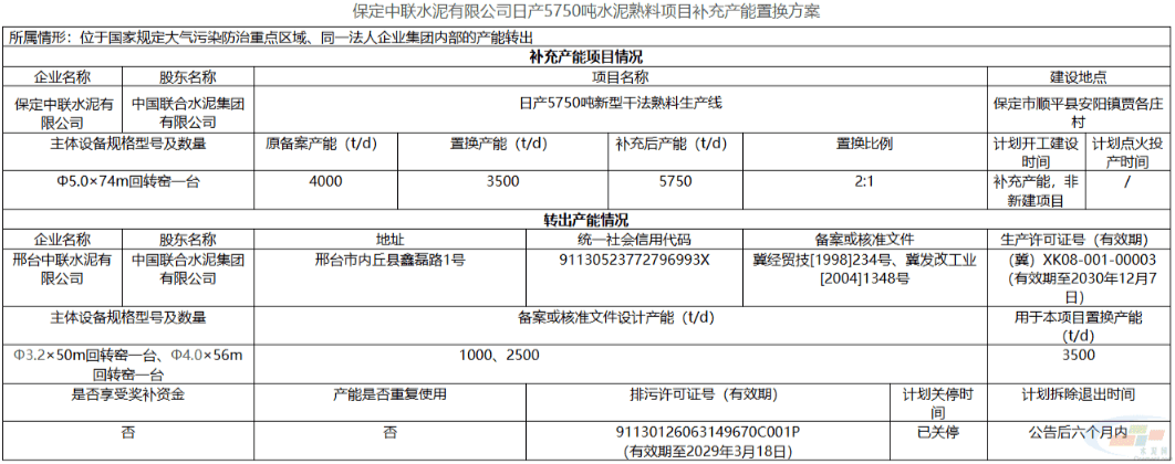 此次补充产能置换比例为2:1,产能指标来源于邢台中联水泥有限公司已关停的日产1000吨和日产2500吨两条熟料生产线。根据公示内容,该项目位于国家规定的大气污染防治重点区域,属于同一法人企业集团内部的产能转出情形。保定中联水泥有限公司位于保定市顺平县,股东为中国联合水泥集团有限公司。邢台中联水泥有限公司位于邢台市内丘县,其两条生产线均已关停,计划在公示公告后六个月内完成拆除退出。