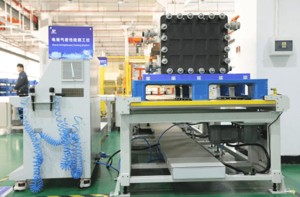 该高功率密度液流电池电堆自动化产线设计年产能为100兆瓦,整合了自动堆叠、压装紧固、翻转检测及气密检测等关键工艺,通过自动化生产提升电堆装配效率和一致性,支持规模化制造。