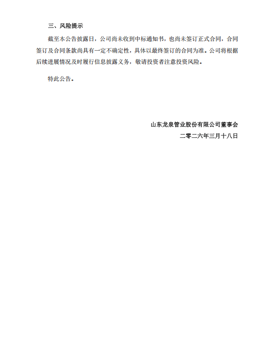 龙泉股份3月18日公告,3月17日,襄阳市公共资源交易电子服务系统发布了《城市水源替代工程项目原水主管工程用预应力钢筒混凝土管及管件(第二次)中标结果公告》,确定公司为中标人,中标价为9942.75万元。中标价约占公司2024年度经审计营业收入的8.67%,本项目的履行预计对供货期间内公司的营业收入和营业利润产生一定积极影响。