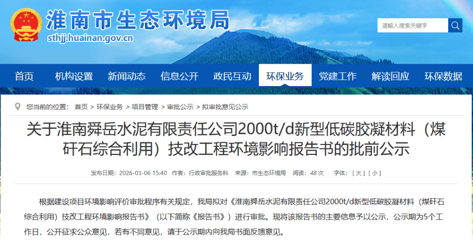 近期,安徽省淮南市生态环境局对淮南舜岳水泥有限责任公司一项技改项目进行了批前公示。该项目旨在将原有熟料生产线改造为新型低碳胶凝材料生产线,总投资额超过6400万元,其中环保投入占1320万元。这标志着该企业正式退出熟料市场,转向新材料领域寻求发展。