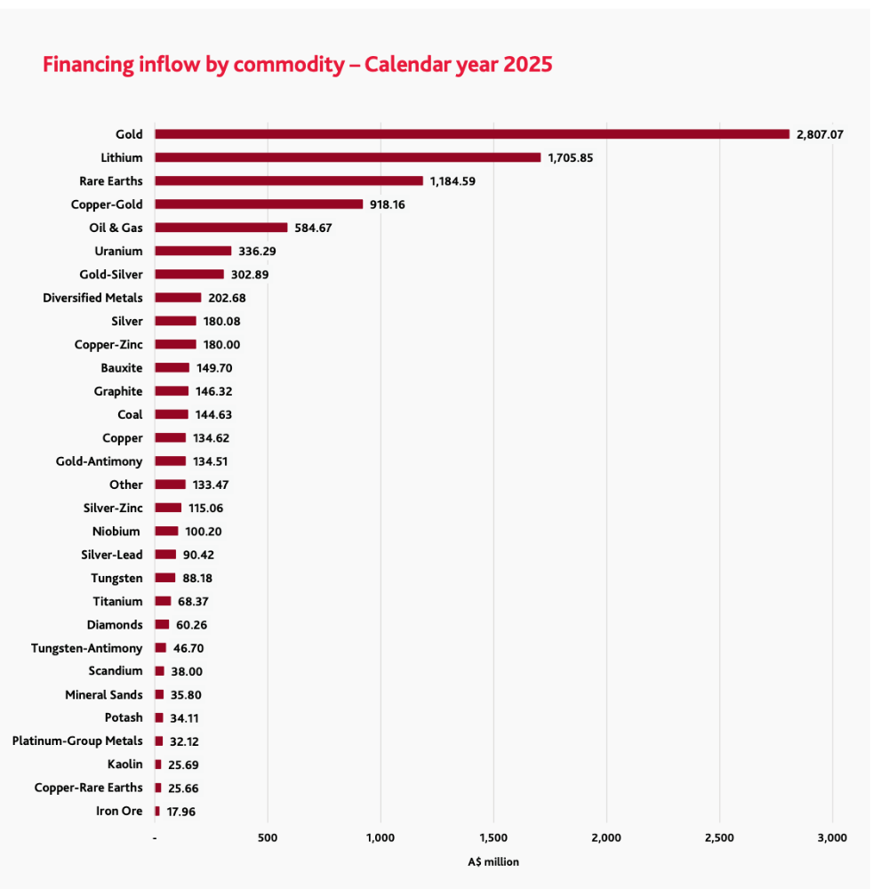在小型矿企市场中,黄金持续占据主导地位,而锂等大宗商品也显示出复苏迹象。在筹资额超过1000万美元的公司中,锂成为本季度最大的筹资领域,共筹集了10.9亿美元,这主要得益于Vulcan Energy Resources (ASX:VUL)为其在德国的Lionheart地热锂项目获得的9.57亿美元资金。European Lithium (ASX:EUR)也筹集了近1亿美元,该公司持有纳斯达克上市公司Critical Metals Corp的大量股份,并拥有其在欧洲的Tanbreez稀土和Wolfsberg锂项目。