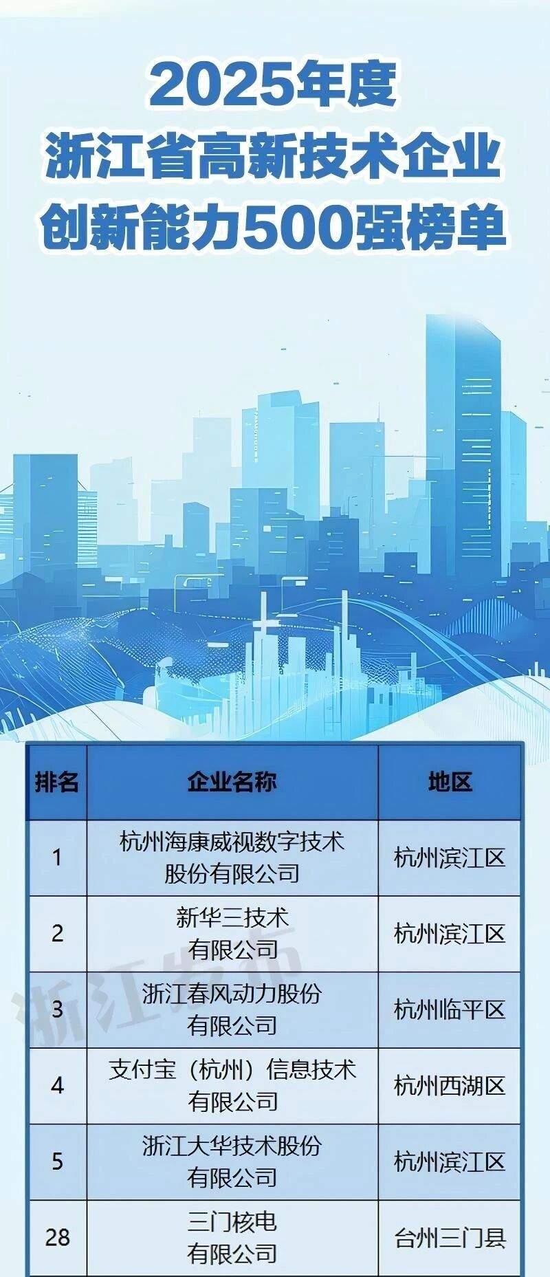 近日,2025年度中国浙江省国家高新技术企业创新能力500强榜单揭晓,中国浙江三门核电以第28位的排名登榜。