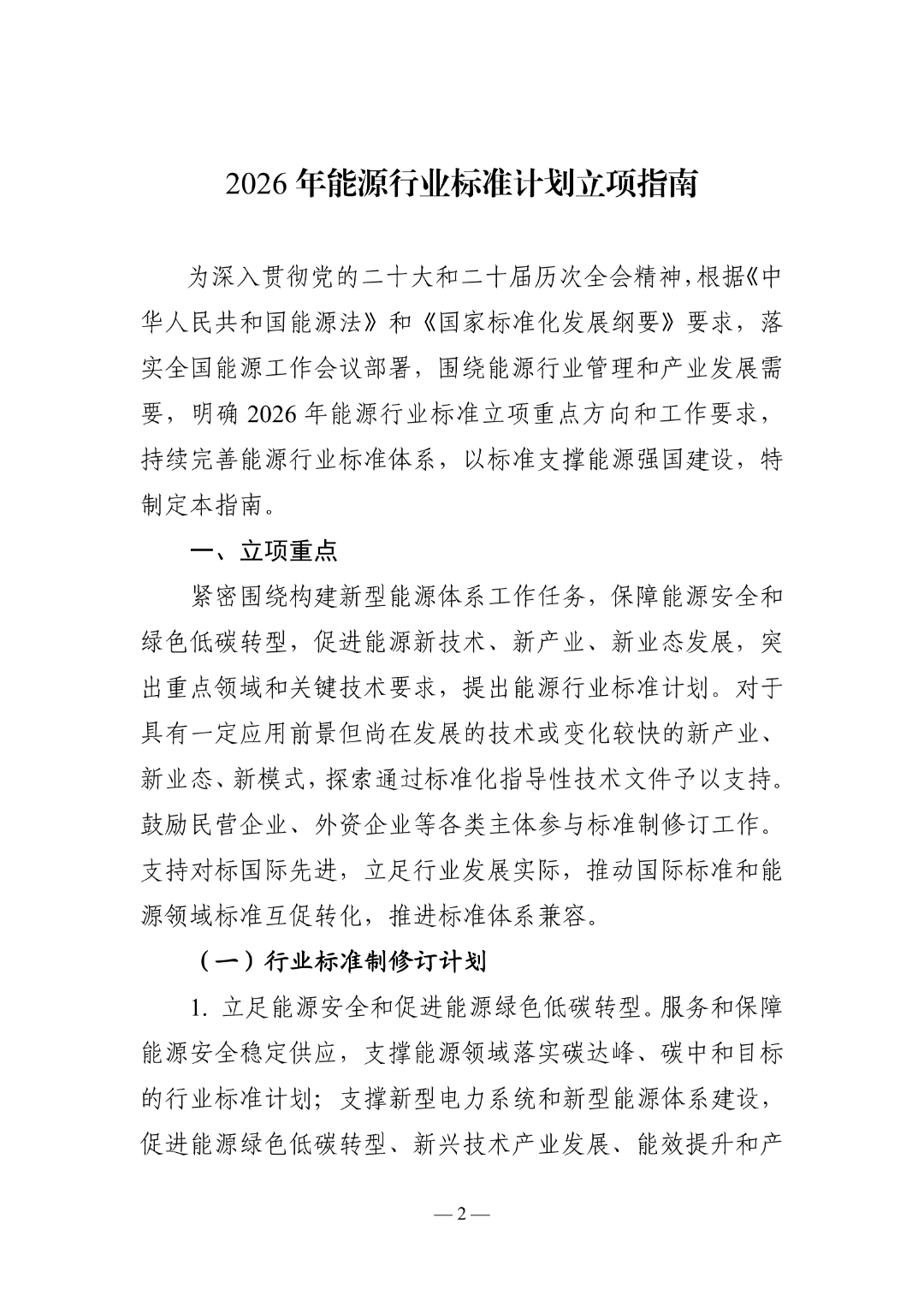 中国国家能源局综合司关于印发《2026年能源行业标准计划立项指南》的通知