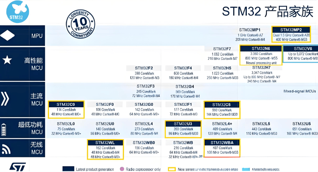 因为自2007年首款STM32F1诞生以来,这系列历经19年演进的微控制器已成为全球通用MCU当之无愧的市场冠军。迄今为止,ST也已推出超4000种型号MCU,打造了覆盖“入门级到高性能”的超低功耗MCU、主流MCU、高性能MCU、无线MCU与微处理器(MPU)五大核心系列全维度产品矩阵。
