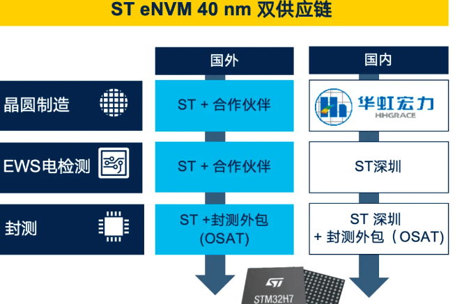据ST介绍,在前端晶圆制造环节,意法半导体与华虹宏力已经有了长达十五年的合作历程。以此为基础上,ST和华虹在2024年底宣布,双方将进一步深化了双方的长期合作伙伴关系。具体而言就是华虹采用与意法半导体全球晶圆厂完全一致的40纳米嵌入式非易失性存储器(eNVM)技术和质量管控标准,确保本地制造的产品在质量和兼容性上与意法半导体全球标准无缝衔接。