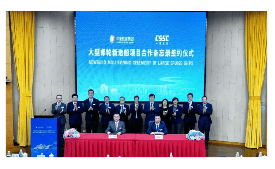 3月20日,中国船舶集团有限公司与中国旅游集团有限公司在上海共同签署了《国产大型邮轮新造船项目合作备忘录》。签约仪式上,中船集团总经理王国强、中旅集团总经理范云军以及上海市宝山区副区长肖刚、交通运输部海事局副局长陈德丽等出席并发言。中国工业和信息化部、国务院国资委、上海市崇明区及中远海运集团的相关代表也参加了活动。中船集团副总经理彭原璞和中旅集团副总经理简易代表双方正式签署文件。
