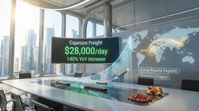 几内亚铝土矿出口激增显著影响了大西洋贸易。几内亚产量占全球铝土矿供应约50%,其出口航程长,如至欧洲5,500-6,500海里,至北美7,000-8,000海里,创造了高吨海里效应,直接支撑租船费率。铝土矿堆积密度为1.2-1.4吨每立方米,带来独特船舶利用率挑战,同时几内亚监管环境的不确定性引入了供应波动风险。