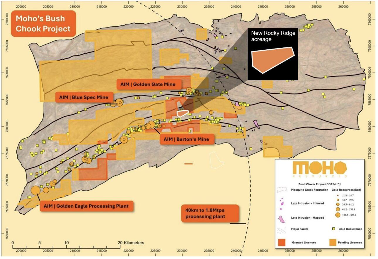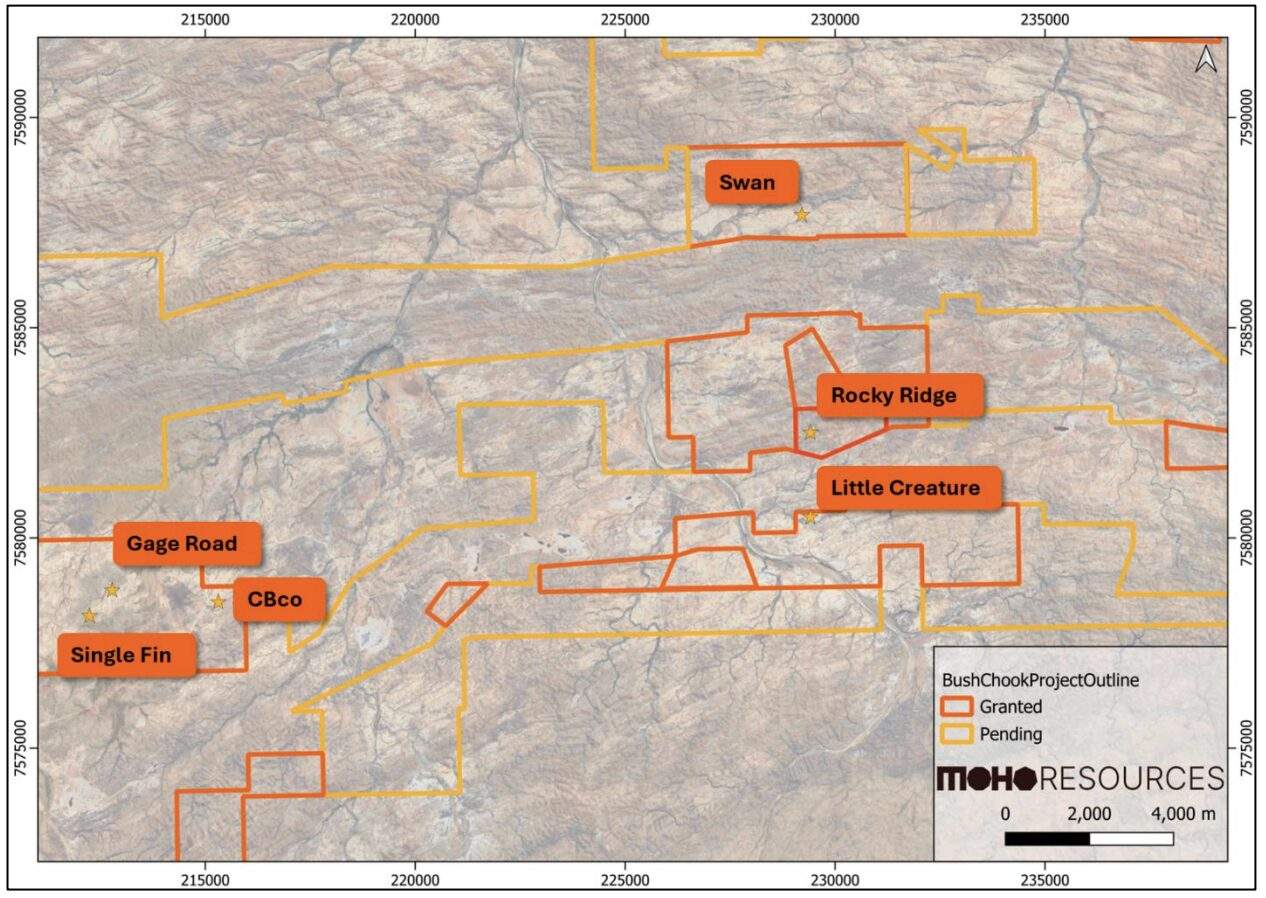 Bush Chook的5000米钻探计划定于5月开始,测试Rocky Ridge及其他目标,包括Gage Road、CBco、Little Creature、Single Fin和Swan前景区。Bush Chook位于Mosquito Creek盆地,该区域过去生产和现有资源约250万盎司黄金,项目距Golden Eagle加工厂40公里内。Moho在442平方公里矿权地上继续目标定义工作,本月初启动4000样本土壤采样活动,第二支现场团队已动员推进。
