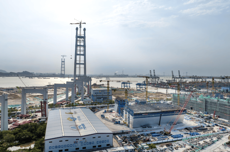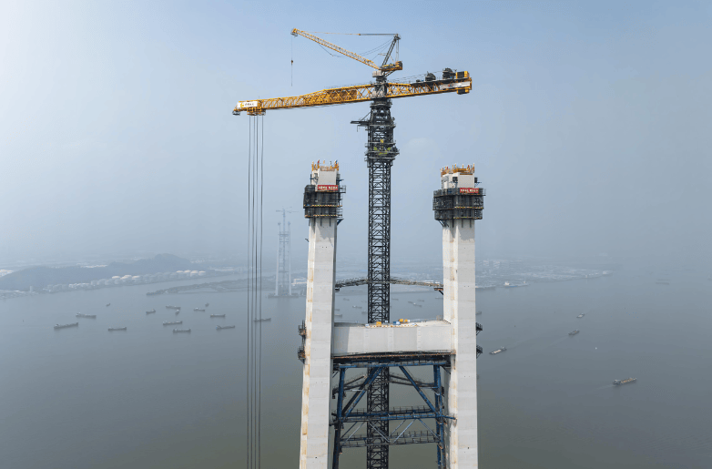 塔柱和横梁钢壳节段完成制造后,将整体运输至桥址,再利用全球最大移动平衡重塔式起重机,吊装至高空进行毫米级精准对接。
