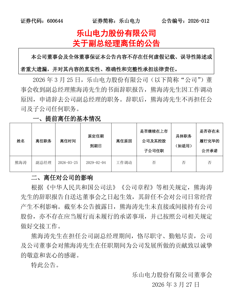 乐山电力发布公告称,3月25日,公司董事会收到副总经理熊海涛先生的书面辞职报告,熊海涛先生因工作调动原因,申请辞去公司副总经理的职务。辞职后,熊海涛先生不再担任公司及子公司任何职务。