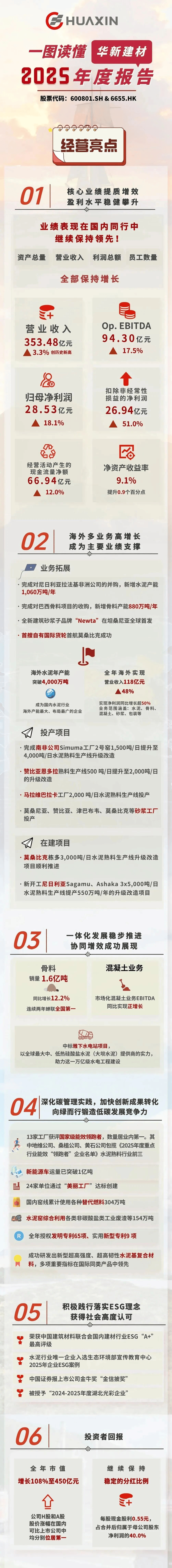 报告显示,华新水泥主业保持稳健发展,核心产品水泥、混凝土等销量保持稳定。公司持续推进绿色低碳转型,在生产过程中加大替代燃料使用比例,降低能耗成本。同时,华新水泥深化区域市场布局,在重点基建项目和城市更新领域扩大市场份额,为业绩增长提供了有力支撑。