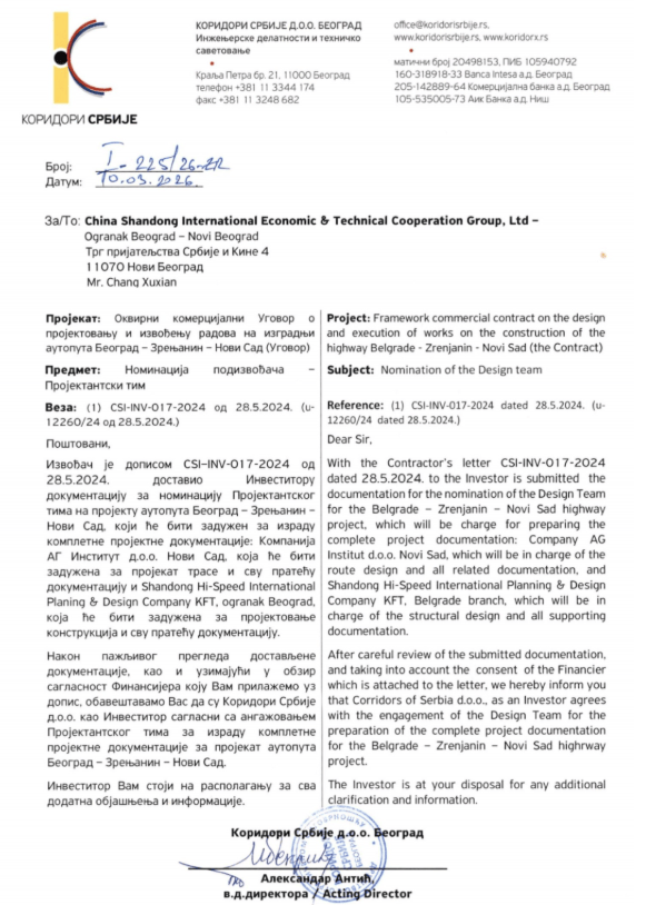 近日,贝尔格莱德-兹雷尼亚宁-诺维萨德高速公路项目(以下简称“兹雷”项目)业主塞尔维亚通道公司正式下发任命函,授权国际合作公司权属单位国际规划设计公司承担项目结构的设计工作。这是中资设计公司首次在塞尔维亚获得大型基建项目设计任命书,标志着公司在欧洲高端基建市场取得重要突破,也是集团协同出海战略的又一重大成果。