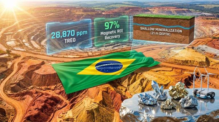 巴西米纳斯吉拉斯州的阿尔托帕拉奈巴火成岩省,因其独特的地质条件与完善的基础设施,正成为全球能源转型矿产的关键区域。该地区通过热带风化作用,在近地表形成了富含稀土元素的矿化层,为开采提供了便利。巴西地质调查局通过“阿尔托帕拉奈巴火成岩省地质与评估项目”加强了地质研究,包括系统填图和地球化学分析。项目负责人保罗·迪亚斯指出:“了解形成、风化、迁移和富集过程是评估矿产潜力的基础。”初步采样显示,总稀土氧化物品位在2,364 ppm至4,906 ppm之间,磁稀土元素浓度为522 ppm至1,352 ppm,峰值样品达28,870 ppm,矿化深度在21米以内,有利于低成本开采。