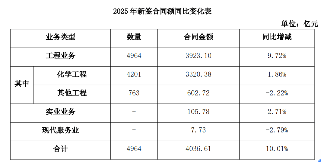 在新签合同方面,2025年中国化学合计新签合同额首次超4000亿元,达到4036.61亿元,较上年同期增长367.21亿元,增幅10.01%。