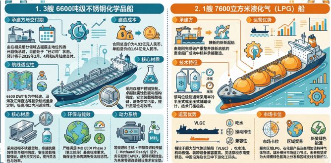 本次订单的具体结构为3艘6600吨级不锈钢化学品船和1艘7600立方米液化气(LPG)船。这些船舶代表了当前中小型液货船市场的最前沿水平,深刻折射出航运业的脱碳演进策略。