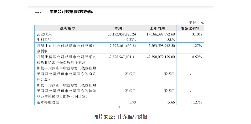在营收增长的同时,其营业成本高达202.60亿元,导致毛利率仍为负值,主营业务航空运输本身仍不具备盈利能力。