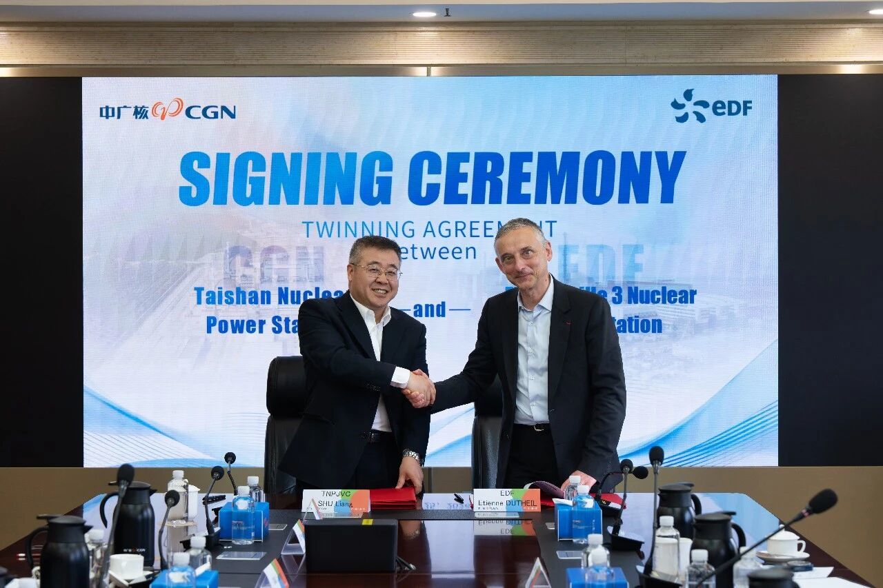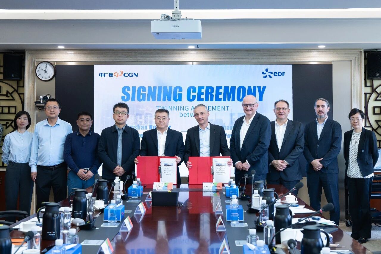 3月25日,中国广东台山核电与法国电力集团(以下简称EDF)正式签署《台山核电-弗拉芒维尔3号机组姊妹电站支持协议》。公司党委副书记、总经理舒亮,党委委员、副总经理李国强在台山核电现场会见EDF DPN(运营事业部)总裁Etienne Dutheil一行。