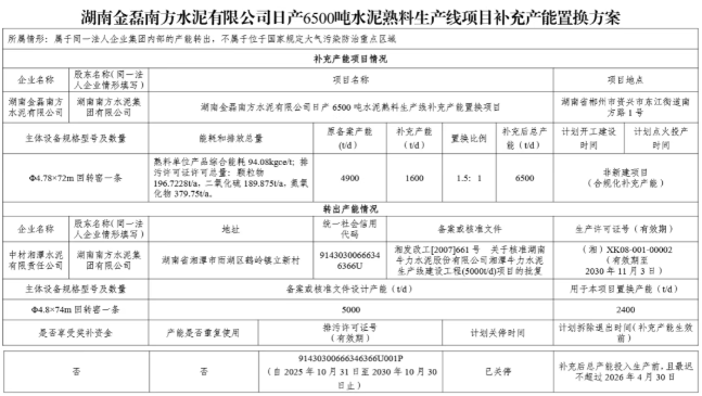 根据公示内容,湖南金磊南方水泥有限公司的这条熟料生产线原备案产能为4900吨每天,现补充1600吨每天,总产能达到6500吨每天。置换比例设定为1.5比1,意味着需淘汰更多旧产能来支持新项目。中材湘潭水泥有限责任公司的一条5000吨每天熟料生产线中,有2400吨每天产能被用于本次置换,该生产线计划在2026年4月30日前拆除退出。