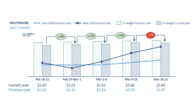 根据航空货运市场情报的领先提供商WorldACD市场数据,在3月16日至22日的第12周,全球空运运费持续上涨,平均全市场价格周环比增长7%,达到每公斤2.84美元。现货价格也上升了6%,至每公斤3.38美元,主要受中东和南亚(MESA)及亚太市场推动。数据显示,全球货运吨位较前一周下降1%,与去年同期相比减少6%,反映出关键市场运力受限。