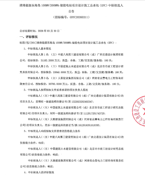 维度网讯, 3月25日,清烽能源东海岛100MW/200MWh储能电站项目的设计施工总承包(EPC)中标候选人名单对外公布。该项目位于广东省湛江市开发区东山街道,计划建设一座独立构网型储能电站,采用磷酸铁锂电池技术,以户外预制舱形式布置。电站将配套新建一座110千伏升压站,通过一条约1.1公里长的110千伏线路接入湛江电网。项目建成后,将参与广东电力自动化市场的辅助服务,有助于增强区域供电的稳定性。