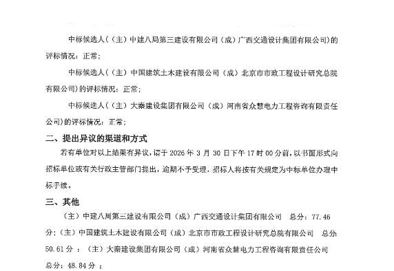 本次招标共有三个联合体进入候选名单,投标报价范围在每瓦时1.5390元至1.6920元之间。第一中标候选人为中建八局第三建设有限公司与广西交通设计集团有限公司组成的联合体,报价为31183.2万元,折合单价约为每瓦时1.5592元。第二中标候选人是中国建筑土木建设有限公司与北京市市政工程设计研究总院有限公司的联合体,报价33840万元,单价约为每瓦时1.6920元。第三中标候选人为大秦建设集团有限公司与河南省众慧电力工程咨询有限责任公司的联合体,报价30780万元,单价约为每瓦时1.5390元。