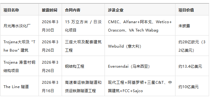 合同变动主要集中在NEOM超级项目群,尤其是The Line 线性城市和 Trojena 山地度假区两大核心板块。