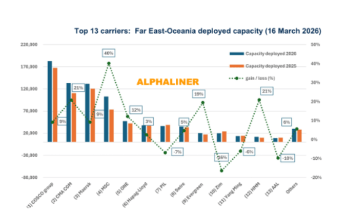 同时,达飞海运集团(CMA CGM)也录得强劲增长,运力增加23,000标准箱,增幅21%,超越马士基升至第二位。其增长部分得益于通过ANL品牌推出的北亚-巴布亚新几内亚-澳大利亚APR2服务。相比之下,马士基增长较为温和,约11,000标准箱,增幅9%,而中远海运保持领先地位,运力超过182,000标准箱,同比增长9%。